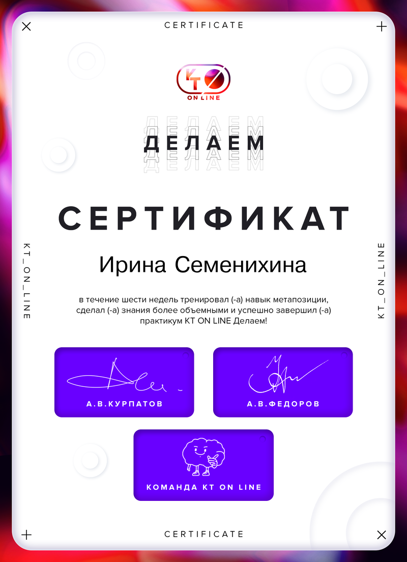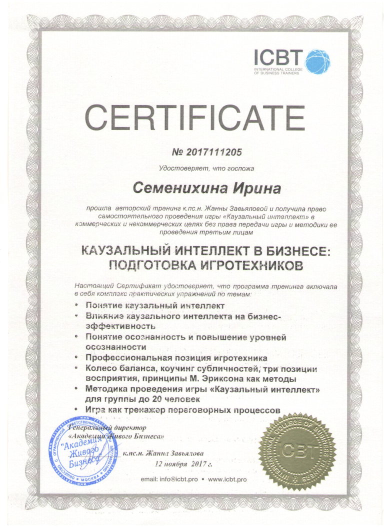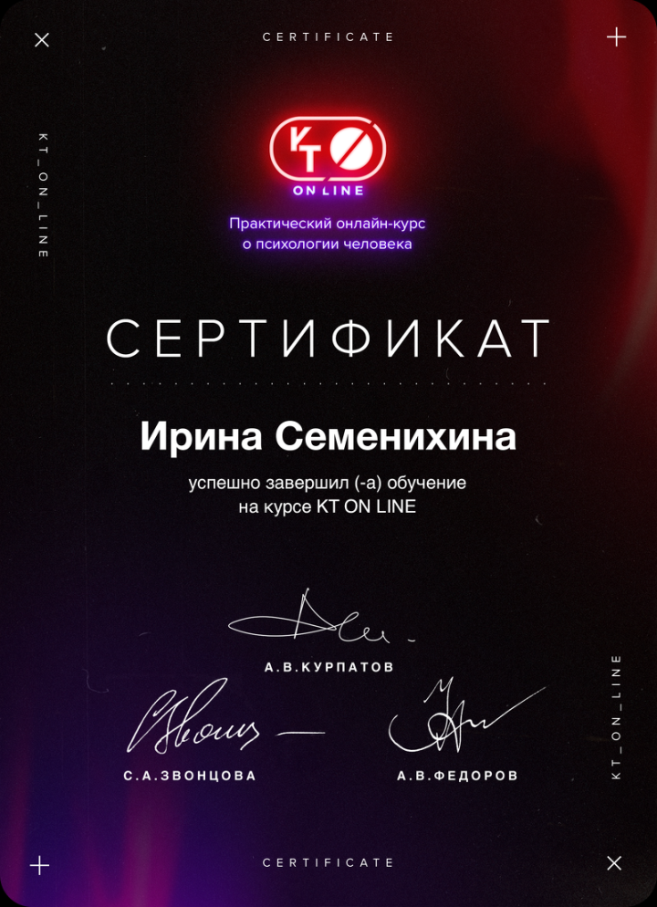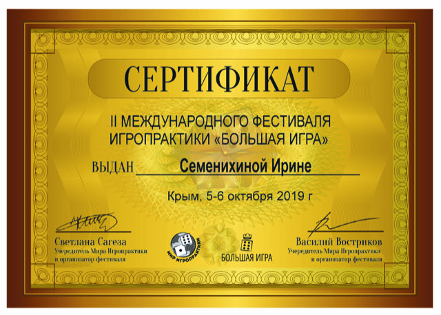 Сертифицированный игротехник психологических и деловых игр и игровых тренингов, закончила курс "Психология человека" Андрея Курпатова и его команды, куратор данного курса, практикум "Делаем!" по изучению метапозиции и реконструкции другого человека. Имею опыт работы с физическими и юридическими лицами. Участвовала в Международных фестивалях "Большая игра" в Москве и Крыму. Член сообщества игротехников "Каузального интеллекта" и ДПО ("Денежный поток олигарха").